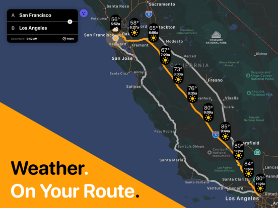 Weather on the Way iOS is a powerful travel companion designed for drivers who care about the weather during their trips. Unlike ordinary weather apps that show data for one fixed location, this innovative tool combines live meteorological forecasts with GPS routing. As you plan your journey, it automatically predicts what conditions you’ll face along the road ahead—rain, snow, fog, or sunshine—so you can adjust departure times or routes for the safest and most comfortable drive.